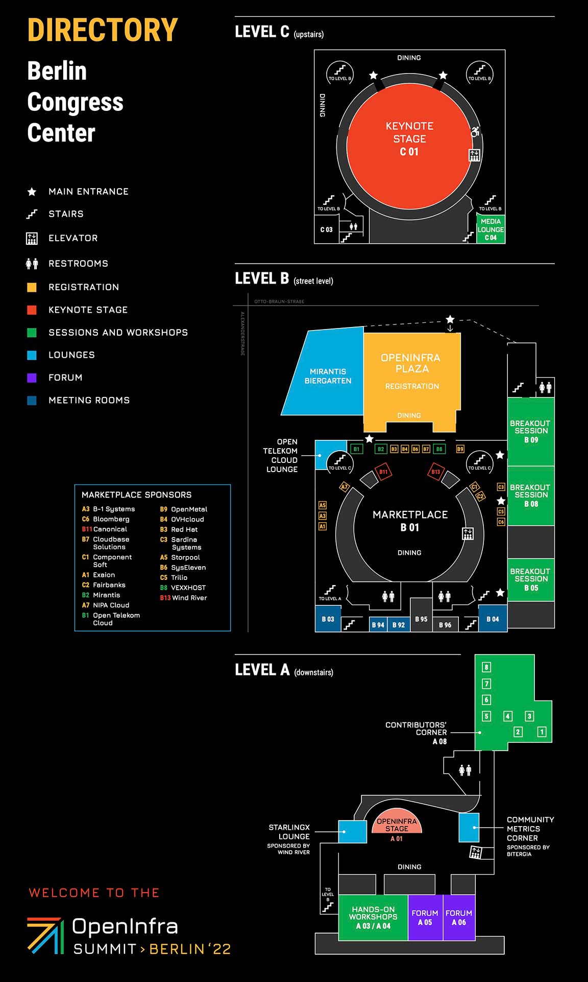 Registration is located outside in the OpenInfra Plaza. This area will always be staffed and can provide updates on lost items, as well as answers to venue and Summit questions.